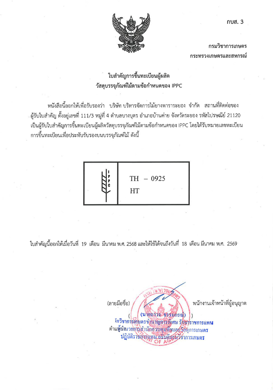 随后于 2016 年 更名为 罗勇橡胶木管理有限公司,以符合公司以橡胶木加工为核心的业务方向。同时,公司将注册资本增加至 30,000,000 泰铢,用于购置土地、引进机械设备及建设规模更大的新厂房,以支持不断扩大的生产能力。